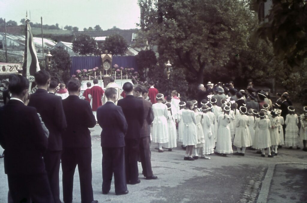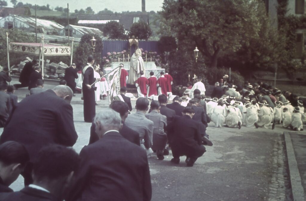 Andächtiges Niederknien vor der Corpus Christi. Im Hintergrund sind die Treibhäuser der Gärtnerei Ley zu erkennen (heute Bienenstrasse 1 – 3).